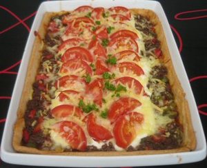 Tænd ovnen på 200 grader. Bland ingredienserne til tærtebunden og rul den tyndt ud. Læg den i et smurt fad og forbag den i 10-15 min. Hak løg og skær peberfrugter i små tern. Svits hakkekød og løg. Tilsæt tacokrydderi, peberfrugt, vand og lad det småkoge i 10 min. Læg fyldet i tærtebunden. Bland creme fraiche, mayonnaise og peber i en anden skål og fordel blandingen over tærten. Skær tomaterne i skiver og fordel det ovenpå. Drys med ost og bag i ca. 20 min. Pynt med finthakket persille.