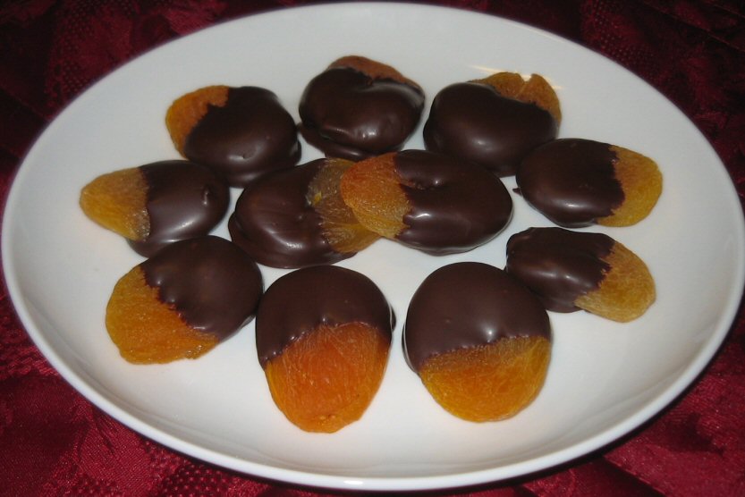 Abrikoserne dyppes i smeltet, mørk chokolade. Lad dem tørre helt før servering. Opbevares i køleskab. Serveres kolde til en god kop kaffe.