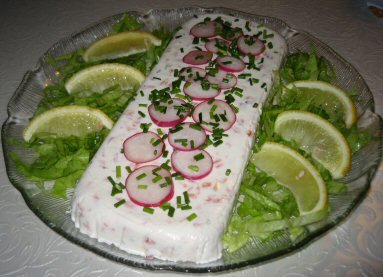 Kom husblassen og det vand der hænger ved, i en lille gryde og smelt det forsigtigt ved lavt blus. Lad herefter husblassen køle lidt af i gryden og rør 1 dl creme fraiche i. Under hurtig omrøring blandes husblassen nu i de øvrige ingredienser. Beklæd en lille form med husholdningsfilm. Hæld moussen i formen og lad den stivne i køleskabet i 4 timer. Vend moussen ud på et fad, når den skal serveres. Læg salatblade eller fintsnittet icebergsalat langs kanten og pynt med radiser i skiver, fintklippet purløg og citronbåde.