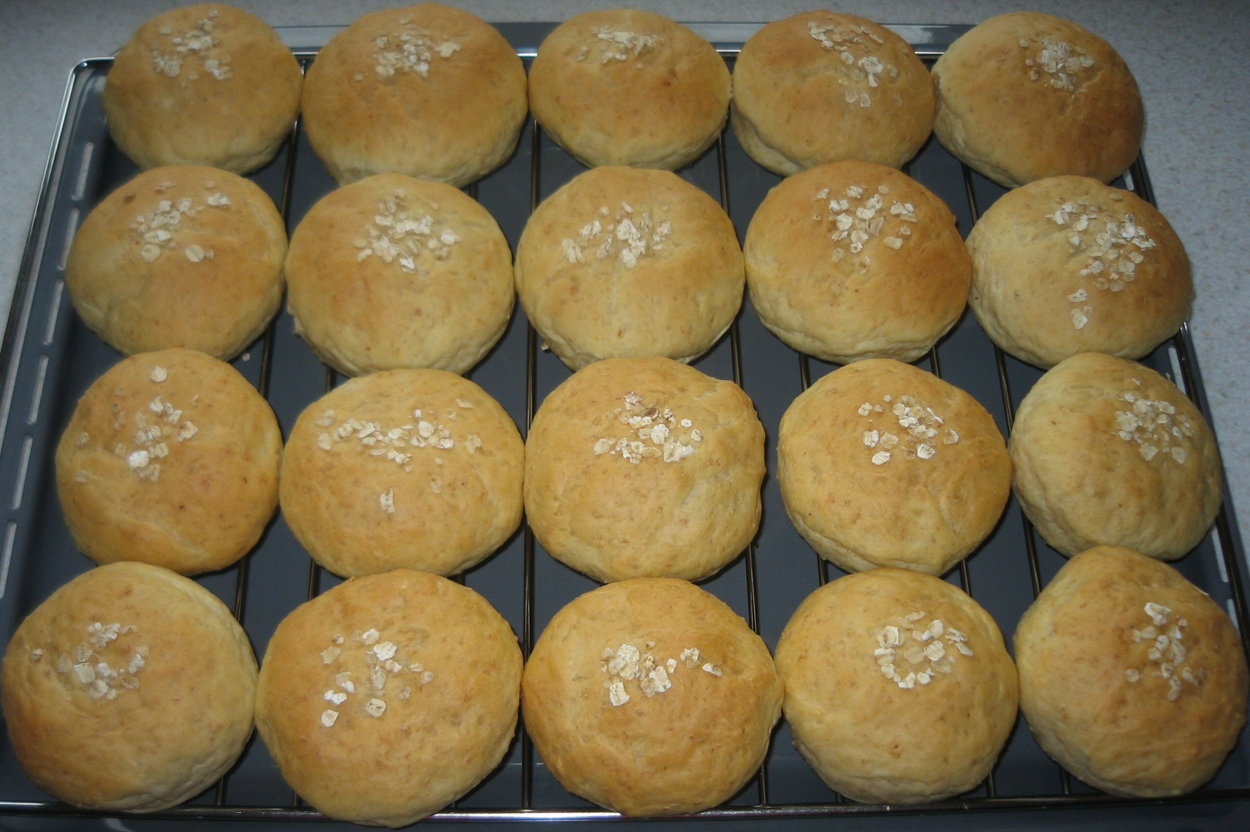 Dejen slås ned og deles i 20 stykker, der formes til boller. Stilles på plade og trykkes flade.