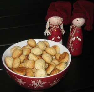 Ingredienserne æltes sammen, formes til pebernødder og bages på midterste rille ved 200 grader i ca. 10 min.