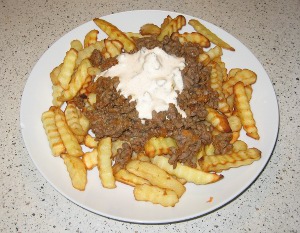 Bag pommes fritterne i ovnen i ca. 20 minutter. Se anvisningen på posen. Brun kødet i lidt smør i en gryde. Kom krydderierne i til kødet og rør godt rundt. Kom creme fraichen i en skål og smag til med allaround krydderi. Kom meget lidt i af gangen da krydderiet indeholder meget salt og det nemt kan blive for meget.