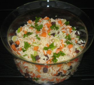 Gulerødderne skæres i små tern og forårsløgene i tynde skiver. Rosiner og de findelte grønsager blandes i de kolde ris. Pisk ingredienserne til dressingen sammen og hæld den over risblandingen. Vend rundt i salaten, så dressingen bliver fordelt. Pynt med grofthakket persille.