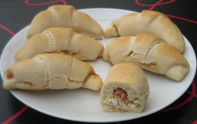 Dej: Gæren røres ud i det lunkne vand, derefter tilsættes olie og salt. Melet røres i lidt efter lidt. Dejen æltes blank og fin, hvorefter den deles i to dele. Hver del rulles ud til en pandekage, som skæres ud i 8 trekanter. På hver trekant lægges en klat af fyldet og dejen rulles sammen fra den brede ende mod spidsen. Hornene sættes på en smurt plade og hæver i 20 minutter lunt og tildækket. Pensles med mælk og bager ved 225 grader i 8 minutter. Afsvaler på en rist.