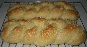 Dejen slås ned og deles i 6 lige store portioner, der rulles til stænger. Stængerne lægges på plade og flettes 3 og 3 til et brød.