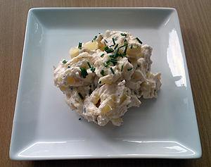 Kartoflerne koges i 20 min. Lad kartoflerne køle ned, hvorefter de skæres i små stykker. Creme fraiche, all round krydderi, salt, peber og purløg blandes i og røres godt sammen. Sættes i køleskabet 30 min. før servering.