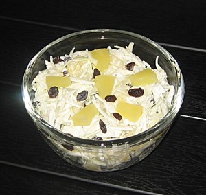 Snit hvidkålen fint. Skær ananasringene i store tern. Bland hvidkål og ananastern. Rør creme fraiche med rørsukker og smag til med citronsaft. Hæld dressingen over salaten og bland salaten. Stil den i køleskabet - gerne nogle timer. Vend rosiner i lige inden servering.