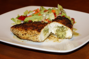 Skær en lomme i hver kyllingfilet ved at bruge en skarp lille kniv. Den nemmeste måde er at stikke kniven ind i kylling fra den 'tykke' ende og derefter udvide lommen. Udfyld derefter lommen med grøn pesto. Til dette kan der bruges en teske.