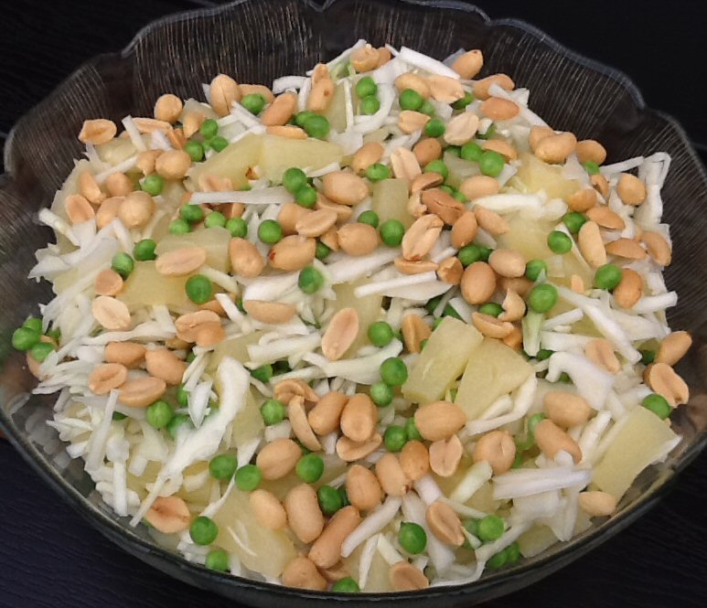 Hvidkålen snittes fint og blandes med ananastern. Ananassaft og citronsaft blandes. Kan evt. smages til med et lille nip sukker. Hæld dressingen over salaten og vend rundt. Salaten trækker i køleskab i mindst 1 time. De optøede ærter blandes i før servering. Pynt med peanuts. Sæt evt. en skål med ekstra peanuts på bordet.
