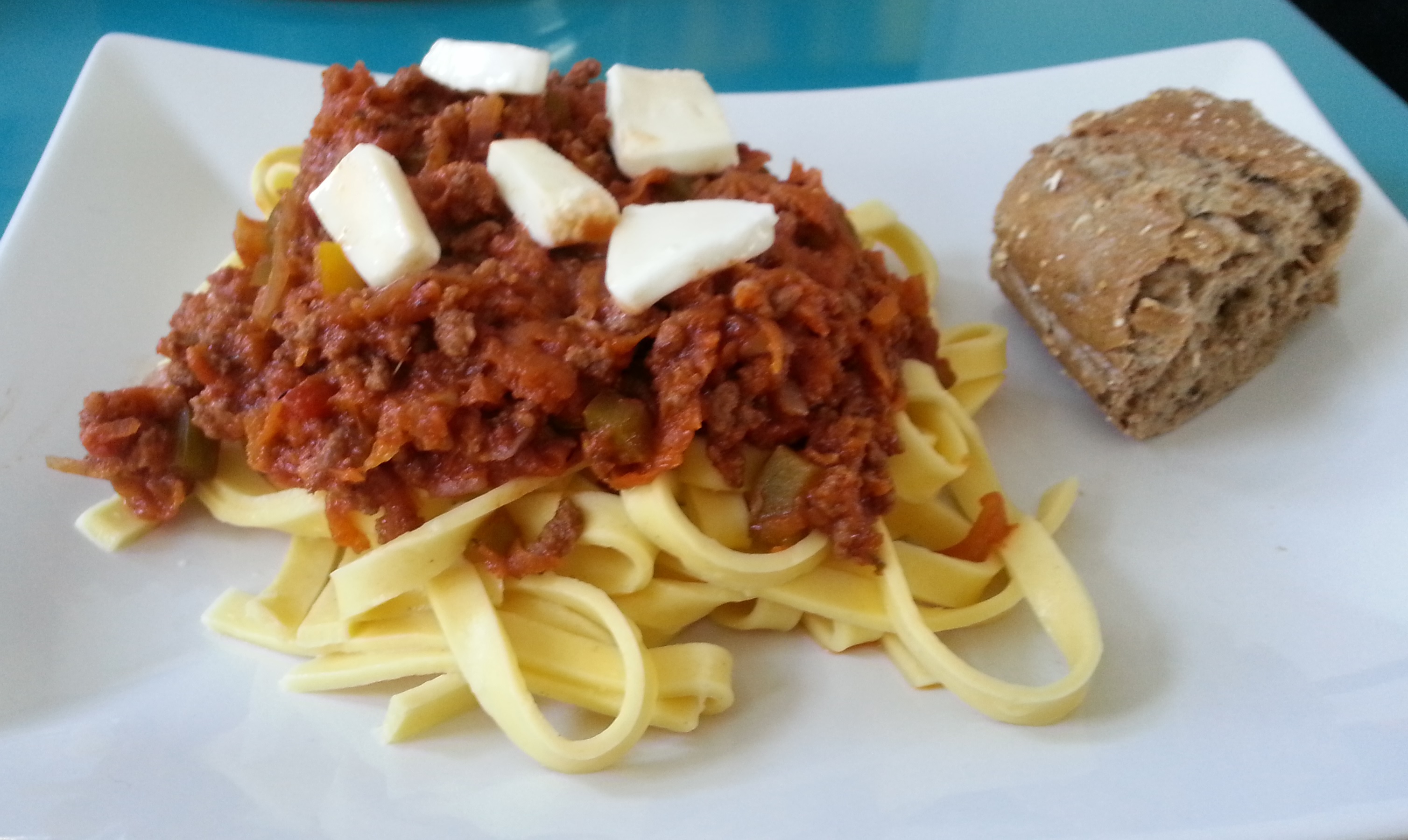 Server pastaen med kødsauce og kom evt. revet ost eller mozzarella ost ovenpå.