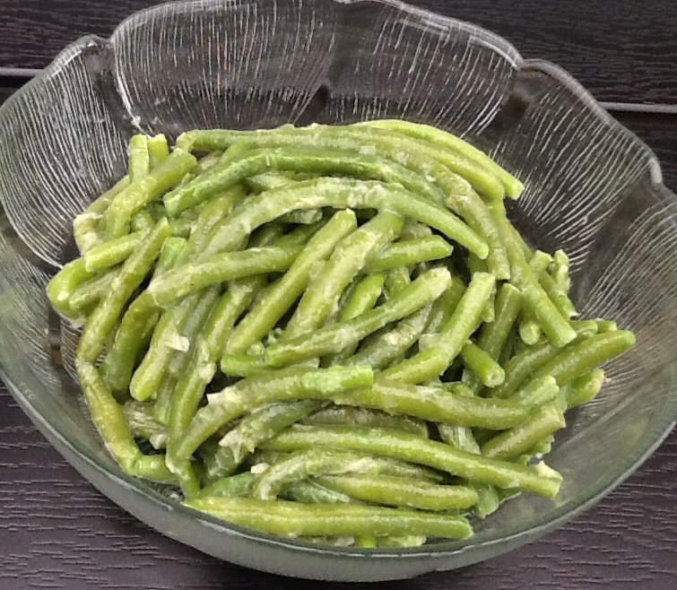Bønnerne koges i letsaltet vand i 8-10 minutter. Vandet hældes fra og bønnerne afkøles. Sennep, olie, salt og peber piskes sammen. Bønnerne vendes i olieblandingen.