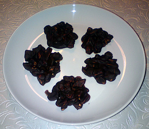 Smelt chokoladen i en tykbundet gryde under omrøring. Klip skumfiduserne i små stykker. Hak peanuts´ene groft. Bland skumfiduser og peanuts i chokoladen, sørg for at det hele er dækket af chokoladen. Sæt chokolademassen på bagepapir med en ske eller teske. Når P-tærterne er størknet, opbevares de i køleskabet.
