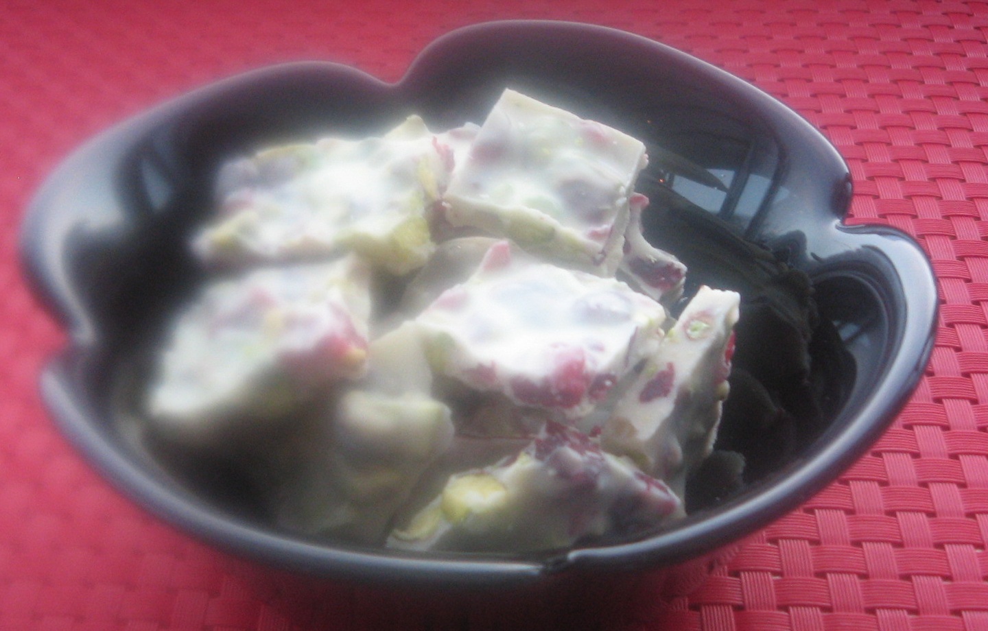 Hak pistacienødder og tranebær groft. Smelt chokoladen i en tykbundet gryde under omrøring. Tilsæt pistacienødder og tranebær. Sørg for at det hele er dækket af chokoladen. Hæld chokolademassen ud på et stykke bagepapir og bred det ud. Når det er størknet, skæres det ud i små firkanter.