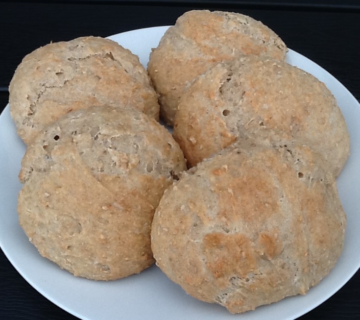 Rist sesamfrøene på en tør pande til de begynder at skifte farve. Lad dem køle af på en tallerken. Opløs gæren i vandet i en stor skål. Tilsæt sesamfrø, æg, salt, olie, honning, havregryn, grahamsmel og mel. Rør dejen grundigt. Dejen skal være lind. Dæk skålen med køkkenfilm og stil den i køleskabet natten over. Tænd ovnen på 200 grader (varmluft 180 grader). Tag dejen ud af køleskabet. Form ca. 20 boller med 2 skeer og sæt dem på bageplader med bagepapir. Bag bollerne 15-18 minutter til de er gyldenbrune.
