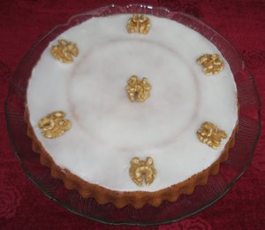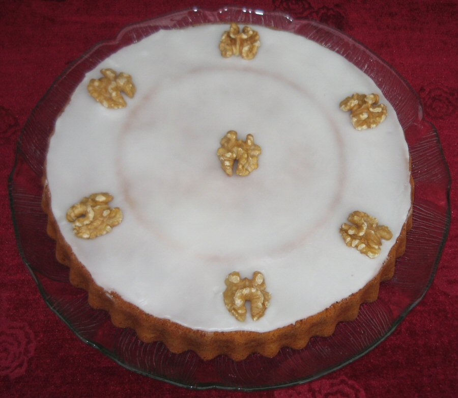 Når kagen er afkølet, pyntes den med glasur og valnødder