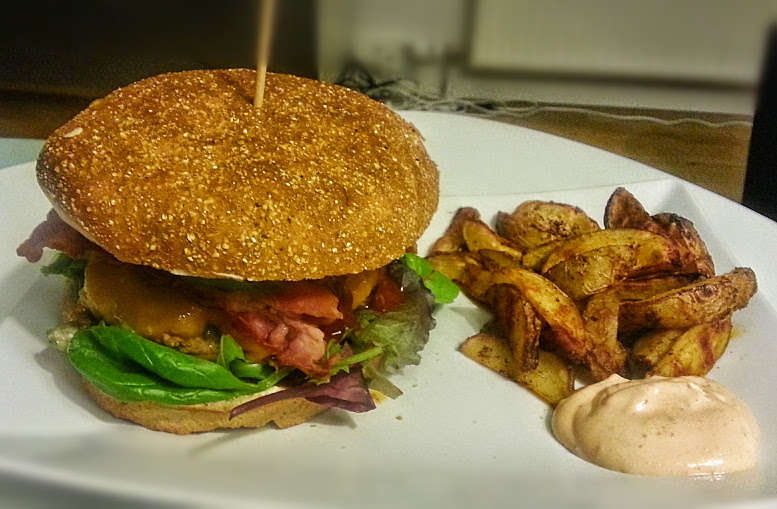 Forbered salaten og steg baconskiverne. Lav chili- og/eller hvidløgsmayonnaise. Se opskrift. Varm burgerbollerne i ovnen.