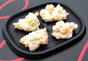 Skær abrikoserne i små tern. Smelt chokoladen i en gryde under omrøring. Rør abrikosternene i chokoladen og kom kokosmel i til blandingen er lidt fast. Brug en teske til at sætte små toppe af blandingen på bagepapir. Opbevar toppene i køleskabet og server dem direkte fra køl.