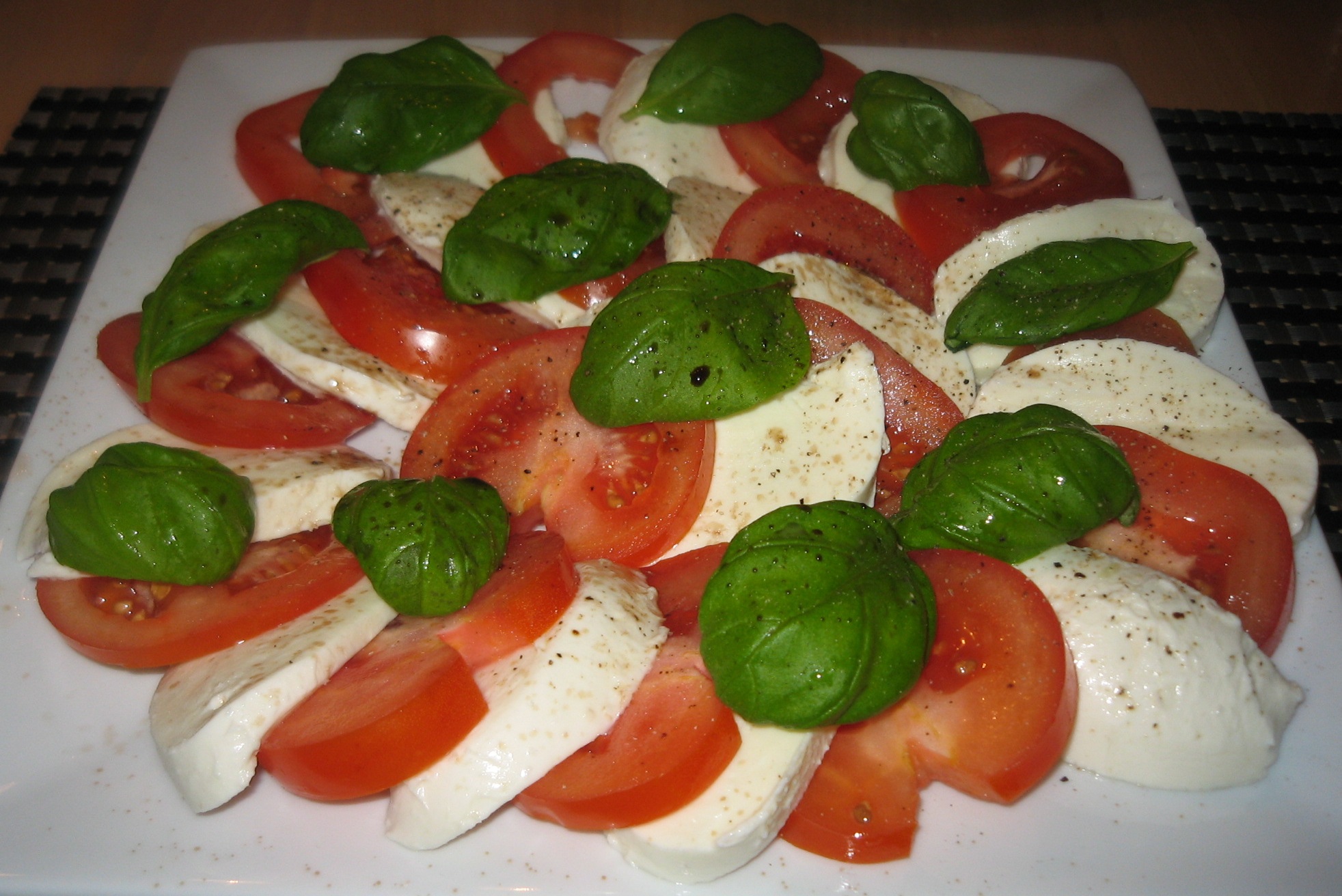 Skær mozzarella og tomater i ens skiver og læg dem skiftevis på et fad.