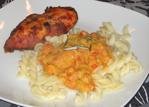 Kom cayennepeber, karry og paprika i, samt lidt salt og peber. Spæd op med creme fine til det får den ønskede konsistens. Smag til med salt og peber, og lad det koge igennem et par minutter.