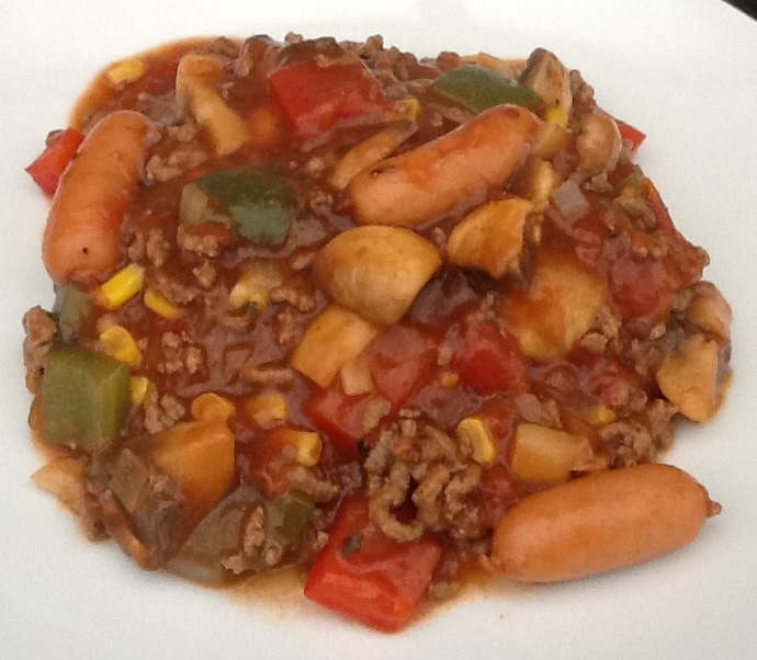Svits oksekødet i en stor gryde ved høj varme sammen med grofthakket løg, hvidløg og krydderier. Tilsæt peberfrugt i store tern og champignoner i kvarte. Efter 2 minutters omrøring tilsættes flåede tomater. Fyld vand/bouillon i en af dåserne og tilsæt det til retten. Bring i kog og tilsæt majs, kulør og sovsejævner. Tilsæt cocktailpølser og lad retten simre i 4 minutter. Serveres med løse ris.