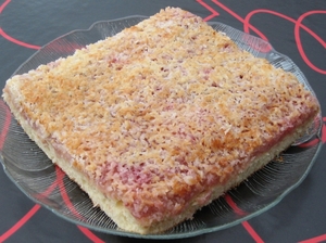 Smør et tyndt lag marmelade på den forbagte kage og hæld kokosglasuren hen over, så den fordeles jævnt. Bag kagen yderligere i 8-10 minutter ved 220 grader. Afkøl i form inden servering.