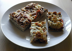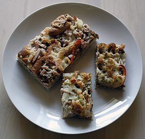 Gæren udrøres i vandet. Olie, sukker og salt blandes i. Grahamsmelet og melet blandes i lidt efter lidt og æltes godt. Dejen hæver i 30 min og derefter rulles ud på en bradepande. Ketchup smøres på pizza bunden og fyldet kommes på. Bages 15-20 min ved 190 grader varmluft.