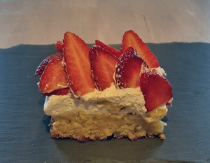 Fløden piskes og græsk yoghurt piskes i. Vanillesukker tilsættes og omrøres godt. Cremen kommes på kagen, når kagen er kold. Pyntes med jordbær eller andet frugt.