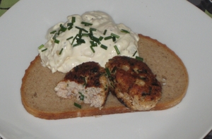 Rør farsen med salt og peber. Tilsæt finthakket løg, havregryn, æg, klippet purløg og vand. Rør farsen godt sammen. Form farsen til frikadeller og steg dem i lidt fedtstof på panden.