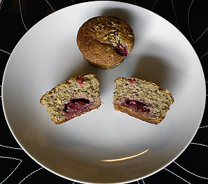 Æg og rørsukker piskes godt. Den smeltede margarine tilsættes. Bland rugmel og bagepulver og rør det i dejen skiftevis med mælken. Kom dejen i muffinsforme og tryk hindbær ned i dejen. Drys mandelsplitter eller hasselnøddeflager over. Bages ved 200 grader i ca. 30 minutter.