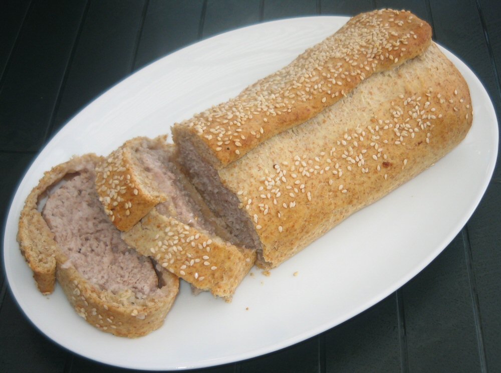 Dejen slås ned og udrulles til en plade ca. 25 x 40 cm. Farsen lægges i en bred stribe midt på dejen. Siderne og enderne foldes ind over og dejen pensles med mælk og drysses med sesamfrø.