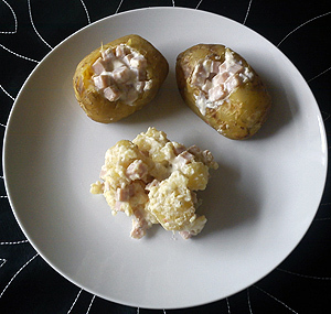 Det overskydnde skinkefyld og kartoffelfyld kommes i et ildfastfad og bages i 10 minutter sammen med kartoflerne.