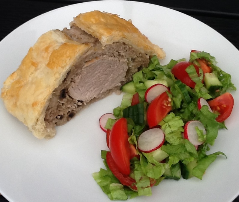 Læg de 3 plader butterdej lidt ind over hinanden og rul dem ud til en plade. Bred halvdelen af farsen ud på dejen, men ikke helt ud til kanterne. Læg mørbraden på midten af farsen og dæk den med resten. Fold butterdejen omkring mørbrad og fars. Bøj dejen lidt ind for enderne. Læg mørbraden med sammenføjningen opad i et smurt, ovnfast fad. Pensl dejen med sammenpisket æg. Sæt fadet midt i ovnen og bag mørbraden ved 200 grader i ca. 50-60 minutter. Server mørbraden varm med en stor skål salat til.