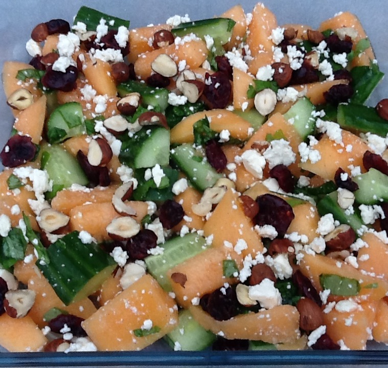 Melonen skæres i både. Skær skallen af og skær hver båd i 3 tern. Agurken flækkes og skæres i grove stykker. Bland melon og agurk i en skål og kom grofthakket eller hele blade basilikum i. Smuldr fetaen groft over salaten. Drys med salt og peber. Vend forsigtigt rundt i salaten. Pynt med halve hasselnøddekerner og/eller tørrede tranebær.