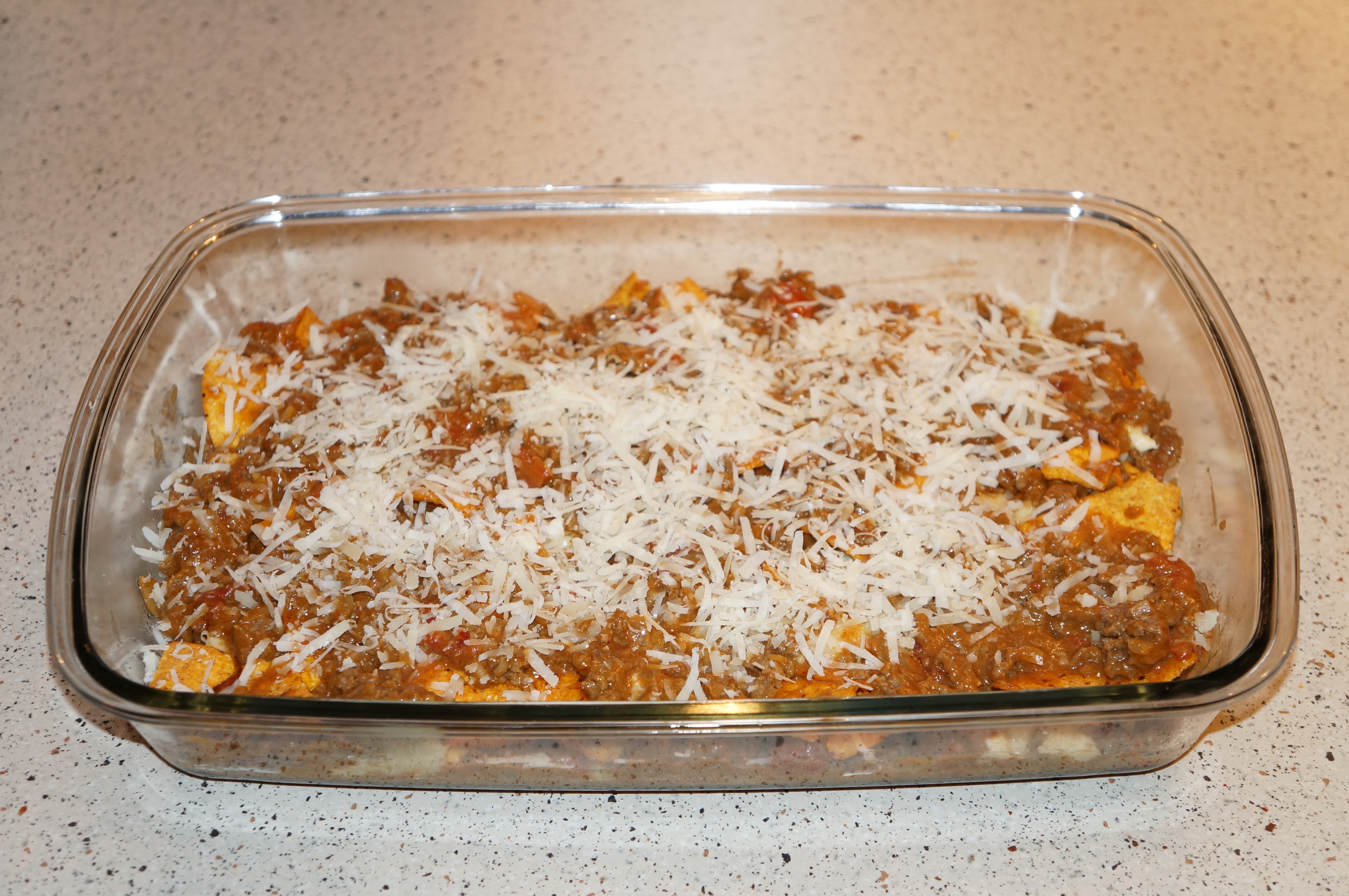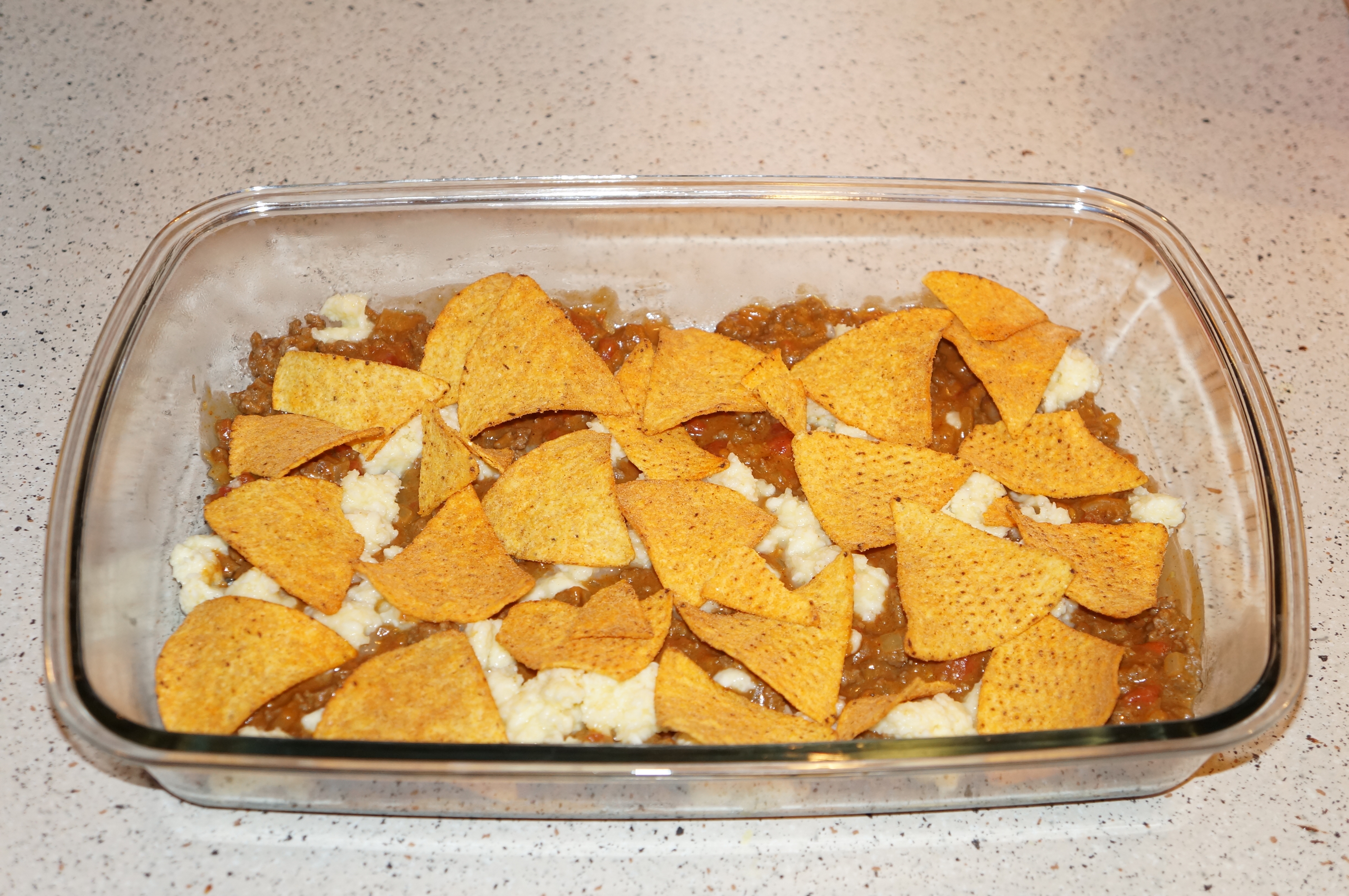 Fyld 1/3 af kødblandingen i et ildfast fad. Fordel halvdelen af osteblandingen over kødet og fordel deres halvdelen af nacho chipsene. Gentag med endnu et lag kød, osteblanding og nacho chips.