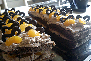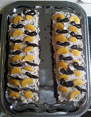 Lagkagebunden deles i 2 og lægges sammen med flødeskum og mandariner, samt pyntes på toppen med flødeskum, mandariner og kringler.