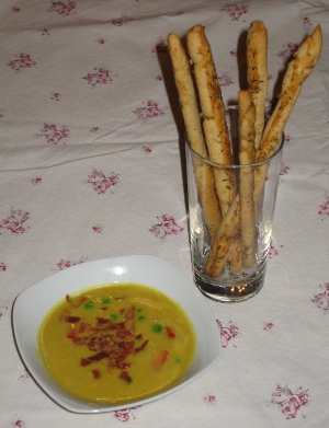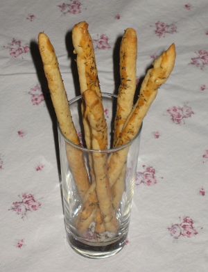 Pensl alle stængerne med et sammenpisket æg og strø spidskommen og timian over. Bag dem i ovnen ved 200 grader i 8-10 minutter, til de begynder at få farve og bliver sprøde.