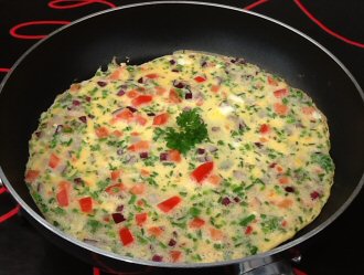 Slå æggene ud i en skål og pisk dem sammmen med en gaffel. Tilsæt salt, peber og de hakkede grønsager. Rør blandingen godt sammen. Varm olien på en pande og kom æggeblandingen på. Steg omeletten i 3-5 minutter. Serveres straks.