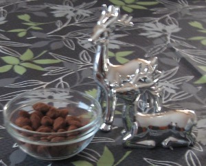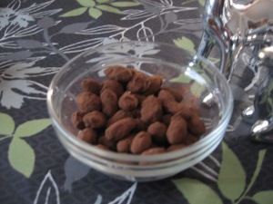 Dup mandlerne et par stykker af gangen i chokoladen og vend dem derefter i lakrids-kakaopulveret. Vend dem godt således de er helt dækket. Læg dem derefter på et stykke bagepapir indtil chokoladen er størknet helt.