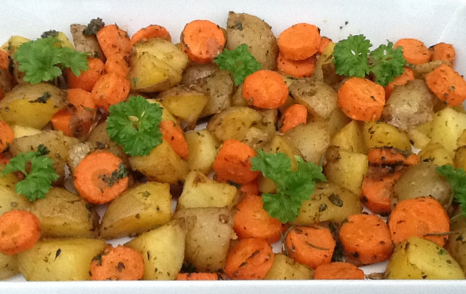 Kartoflerne koges med skræl på. De kogte kartofler skæres i mundrette stykker. Skræl gulerødderne og skær dem i tykke skiver. Kom kartofler og gulerødder i et ovnfast fad. Bland olien med presset hvidløg, finthakket persille, oregano, salt, peber, finthakket rosmarin og sojasovs. Hæld olieblandingen over kartofler og gulerødder og vend forsigtigt rund. Sæt fadet i ovnen ved 180 grader i 20-25 minutter. Pynt med persilleduske inden servering.