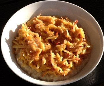 Kom havregryn og vand i en gryde og bring det i kog. Lad det koge et par minutter ved svag varme under omrøring. Tilsæt salt. Hæld havregrøden op og bred groftrevet æble ud over. Drys med kanelsukker.