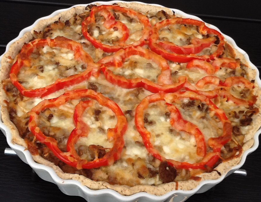 Pisk æggene sammen med hytteosten og tilsæt salt og peber. Hæld æggemassen over farsblandingen, løft lidt op i fyldet hist og her så æggemassen bliver jævnt fordelt. Rød peber skæres i ringe, som lægges ovenpå. Drys til sidst revet ost over.