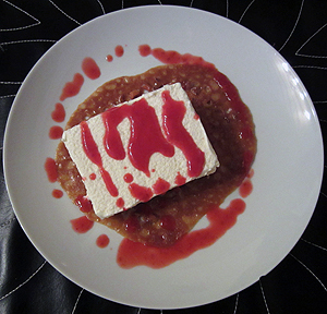 Skær isen i skiver og kom den mellem mandelkagerne. Pynt med hindbær saucen.