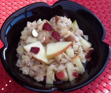 Hæld havregryn i en gryde og kom kogende vand på. Læg låg på og lad havregrynene trække i 5 minutter. Hak tranebær og mandler groft. Æblet skæres i små tern. Tilsæt tranebær, mandler, æble og salt. Varm grøden op, mens der forsigtigt vendes rundt i den. Når grøden er varm, er den klar. Havregrynene skal ikke koge ud.