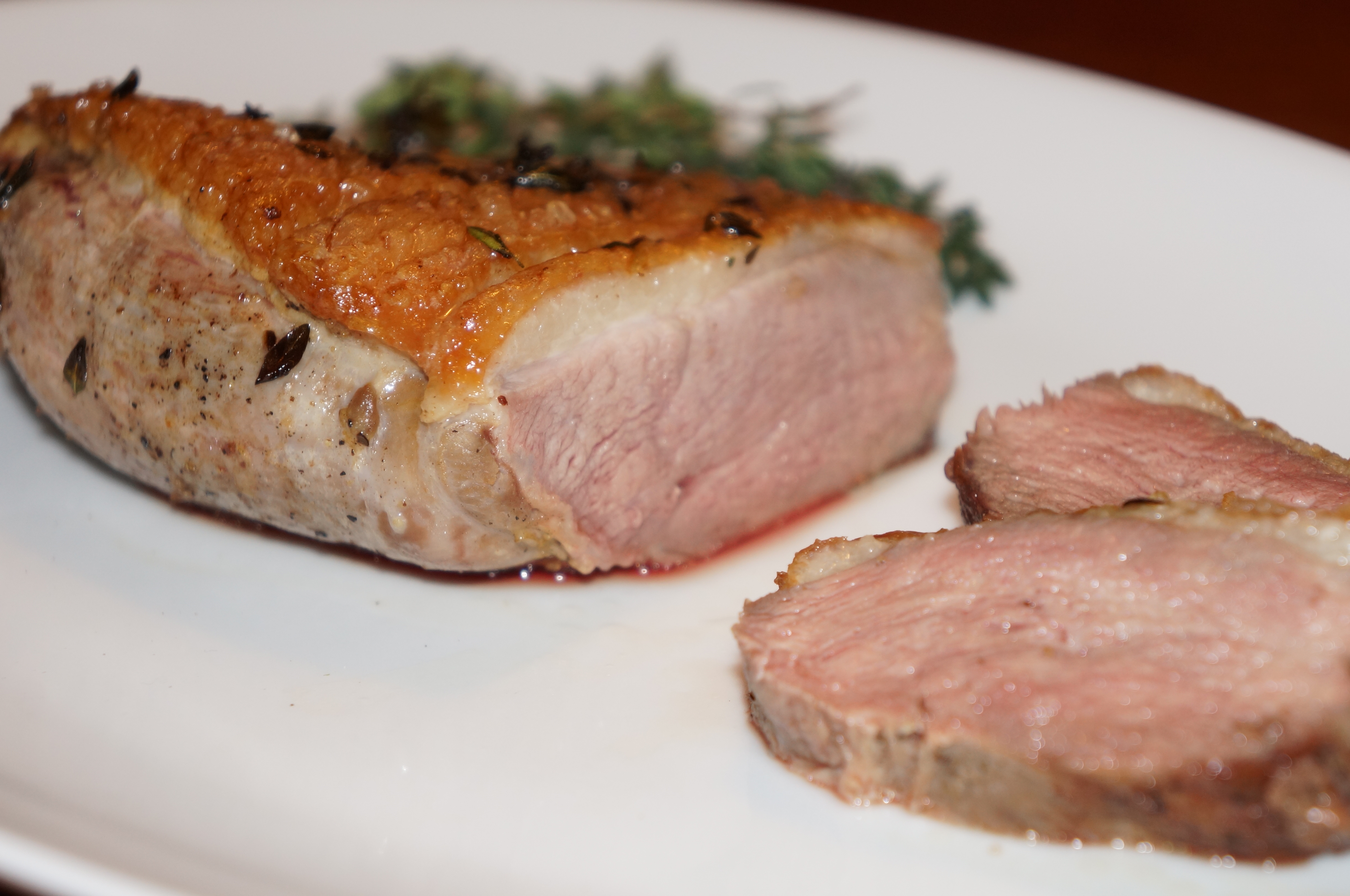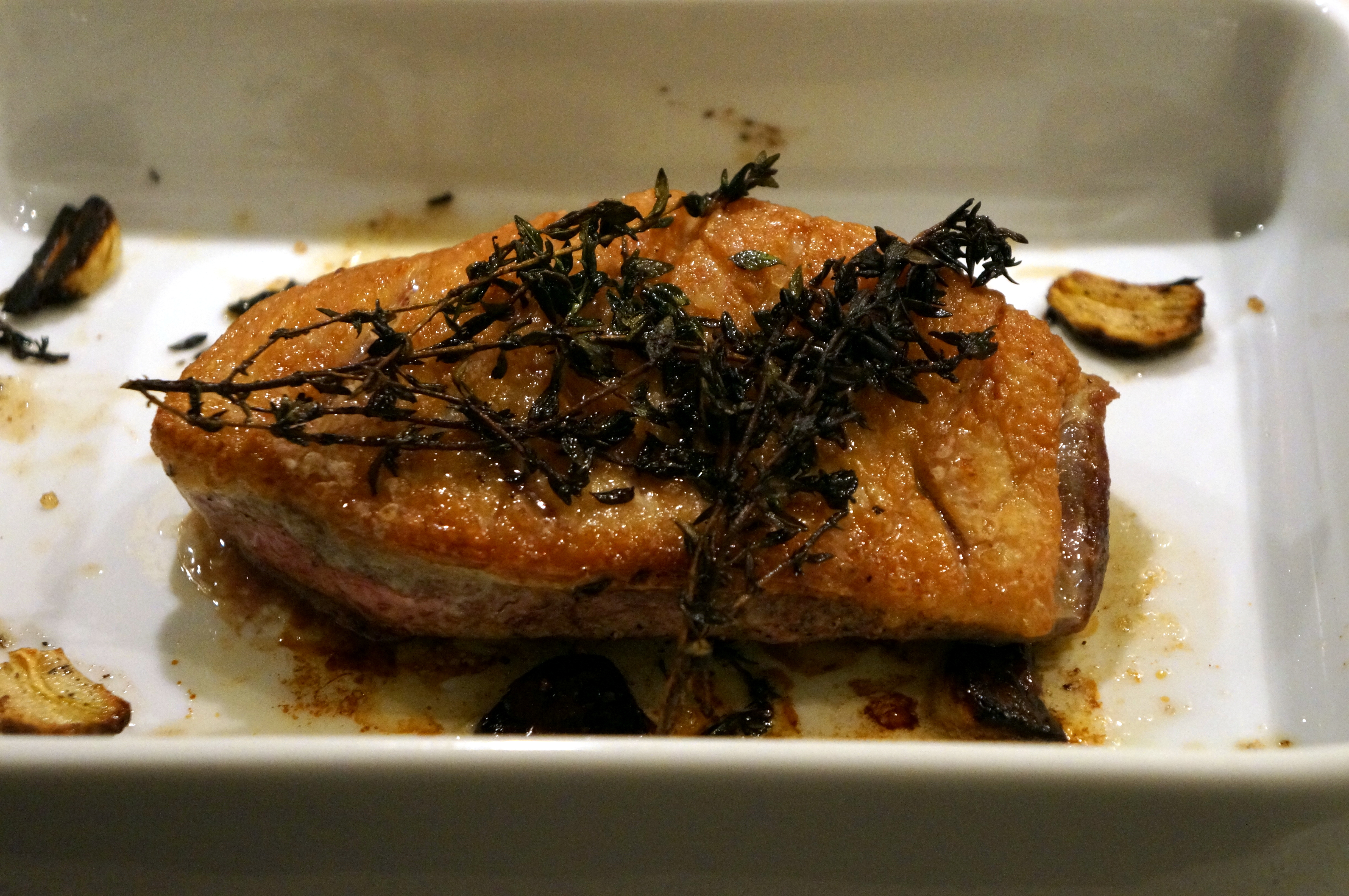 Når andebrystet er færdigt på panden, lægges det i et ovnfast fad med fedtsiden opad. Kom timianen oven på for at få fuld effekt af kvistene. Hvidløgene kan ligeledes kommes i fadet op ad siderne på brystet. Bag det i en forvarmet ovn i 10 minutter for at få andebrystet perfekt sprødt og rosa.