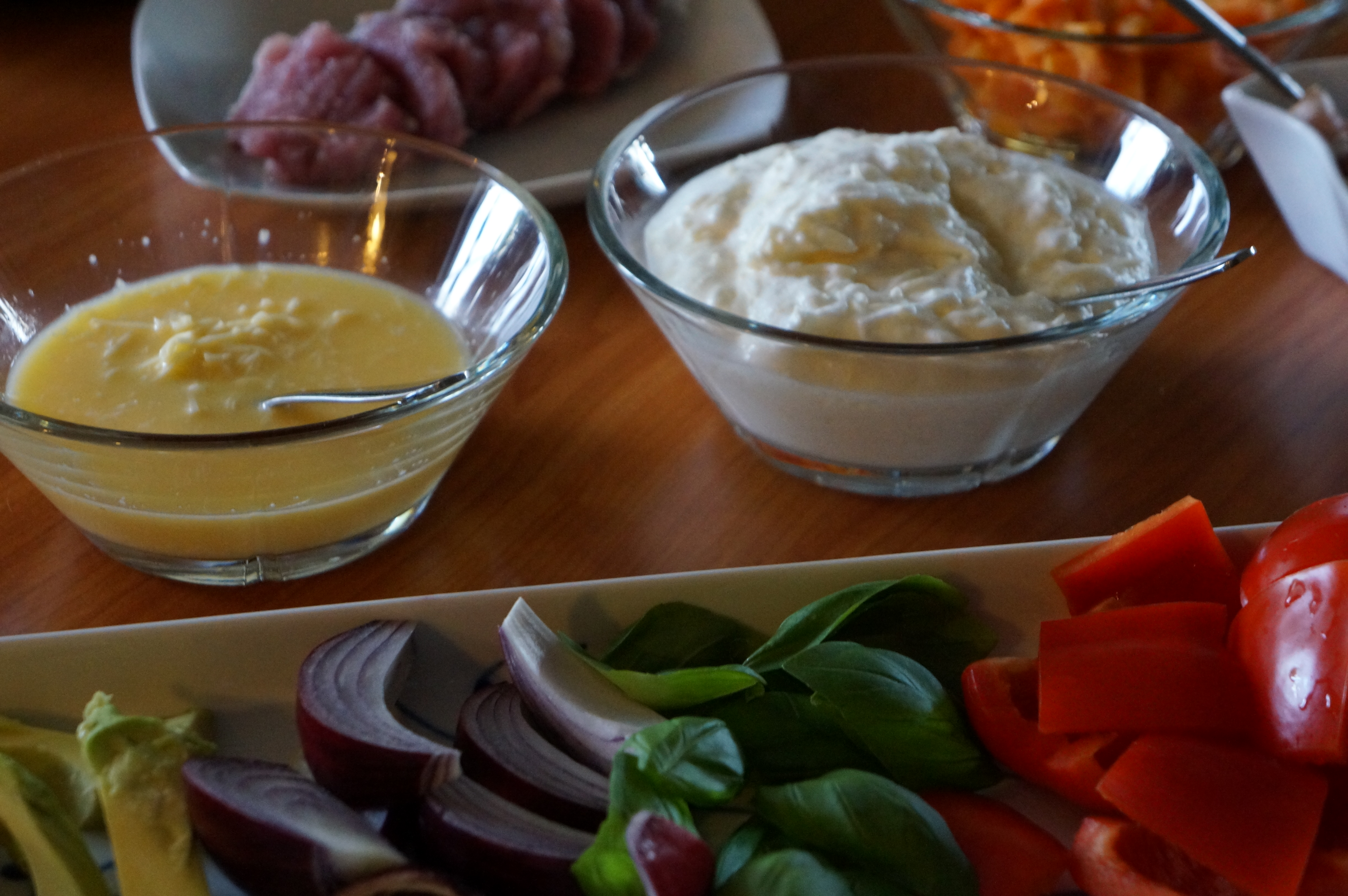 Osten rives og blandes med yoghurten. Æggehviderne piskes stive med 1 knsp salt, og blandes derefter i osteyoghurten. Blanding stilles på bordet sammen med alle de øvrige ingredienser.