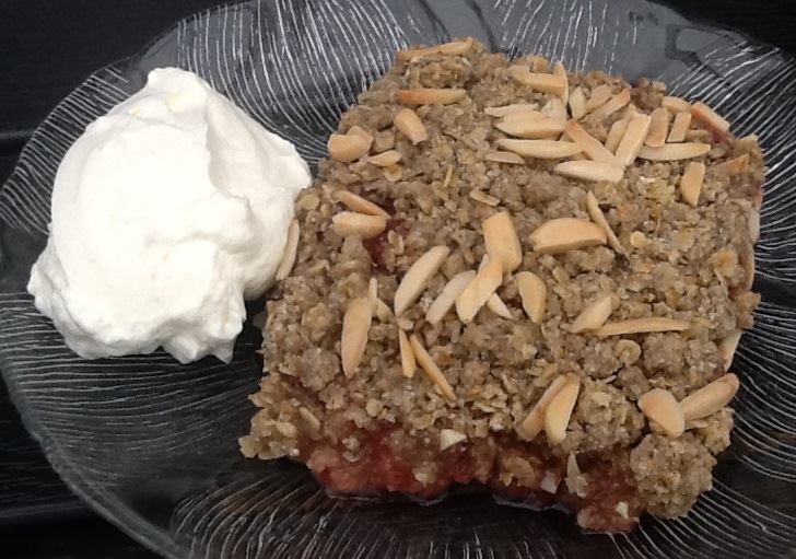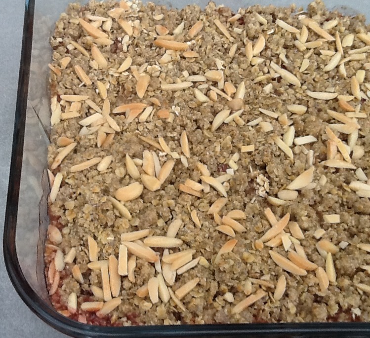 Fordel dejen over rabarberne og drys med mandelsplitter. Bag kagen i yderligere 10-15 minutter til overfladen er gylden. Server crumblen lun med iskoldt flødeskum.