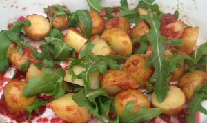 Skrub kartoflerne og tør dem. Læg dem i et ildfast fad, dryp med olie og vend kartoflerne i olien. Drys med salt og peber. Bag kartoflerne ved 200 grader i ca. 20 minutter til de er møre og gyldne. Halver kartoflerne, tilsæt rabarberkompotten og bland det godt. Bag i yderligere 2-3 minutter. Tag fadet ud og vend rucolaen i kartoflerne. Server retten med det samme.