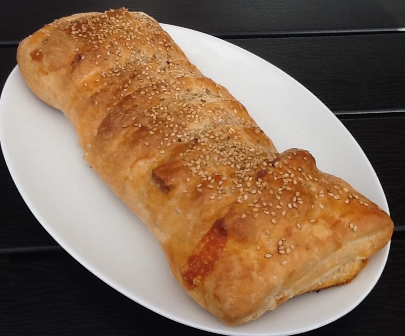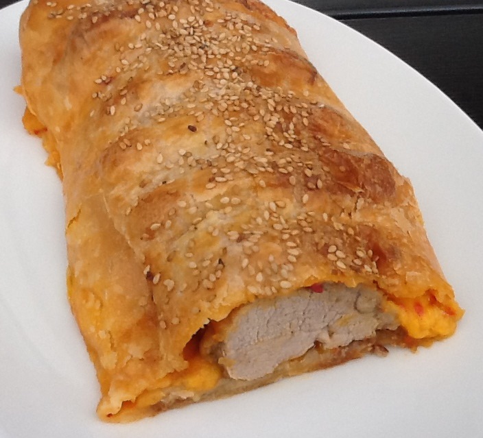 Brun mørbraden på en pande og drys med salt og peber. Butterdejen bredes ud på et stykke bagepapir og smøres med chilipesto. Der skal være en kant på 3 cm fri for pesto hele vejen rundt. Skær osten i trekantede stave. Skær ridser på skrå i mørbraden og put stavene ned i ridserne. Læg mørbraden på den smurte dej med osten nedad. Pak dejen om mørbraden, først enderne, og pensel med æg i limningen (sørg for den er godt lukket, ellers ryger osten ud). Læg butterdejsrullen med sammenføjningen nedad. Pensel med æg og drys med sesamfrø. Bages i 30-35 minutter ved 200 grader.