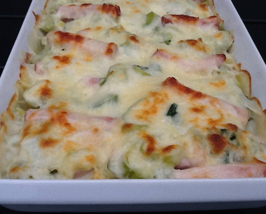 Snit porrerne i 1/2 cm tykke skiver og skyl dem. Kog dem i 3-4 minutter og hæld dem i en sigte. Skær hamburgerryggen i strimler og kartoflerne i skiver. Bland hamburgerryg, kartofler og porrer i et ildfast fad.