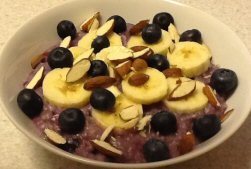 Havregryn, vand og blåbær koges ved svag varme i 5-6 minutter under jævnlig omrøring til bærrene er møre. Smag til med salt. Pynt med friske blåbær, banan i skiver, grofthakkede mandler og eventuelt honning.